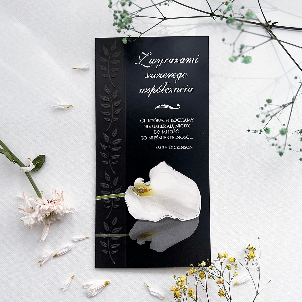 Karnet kondolencyjny w eleganckiej formie wyraża szczere współczucie. Okładka utrzymana jest w głębokiej czerni, z delikatnym, pionowym motywem liści wytłoczonym na lewej stronie. W centralnej części znajduje się cytat Emily Dickinson: „Ci, których kochamy nie umierają nigdy, bo miłość to nieśmiertelność…”, a powyżej napis: „Z wyrazami szczerego współczucia”. Całość dopełnia subtelny wizerunek białej kalii — kwiatu symbolizującego czystość, godność i pamięć o zmarłym — umieszczony w dolnej części kartki.